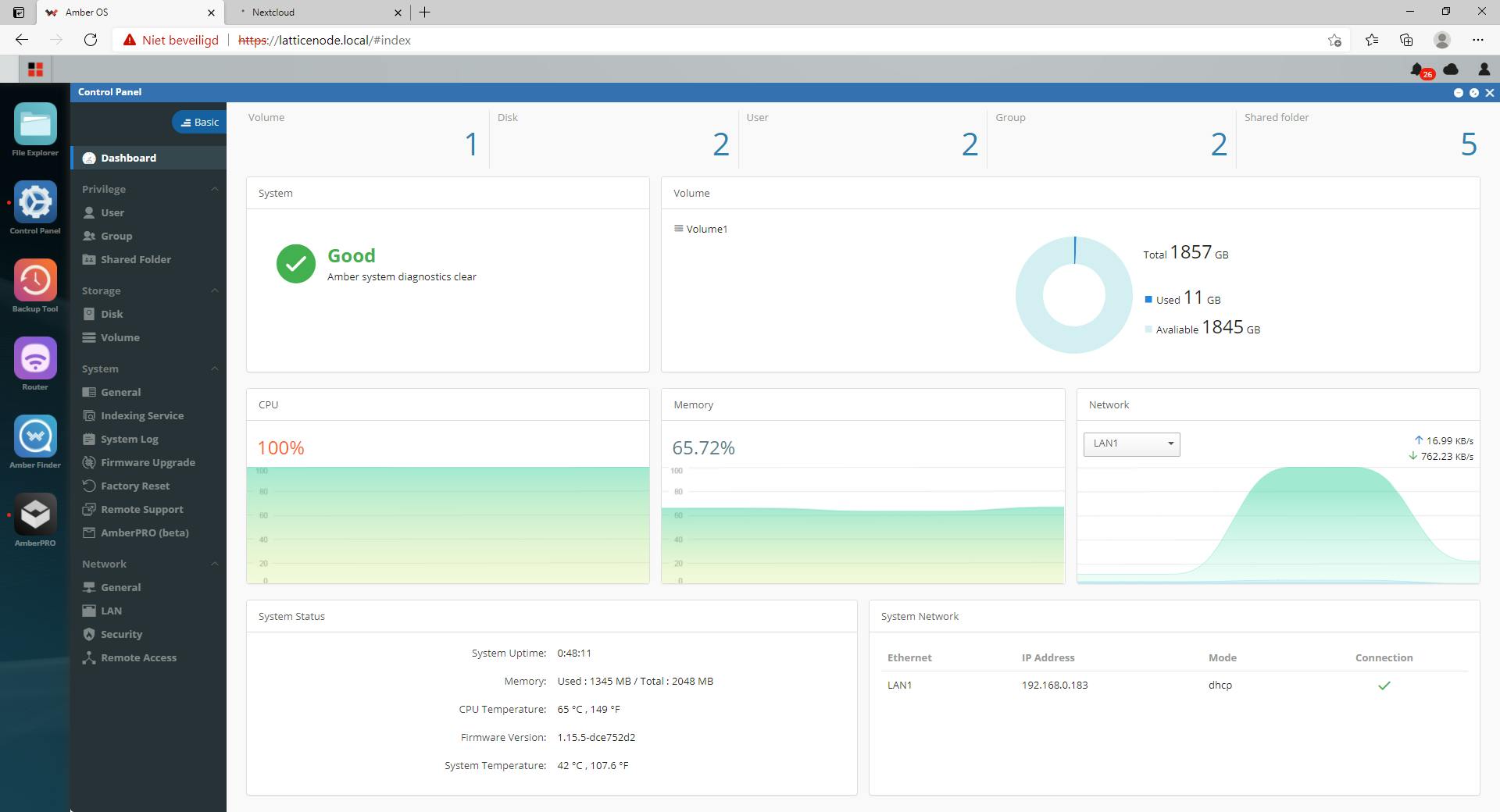 De opslag van de Amber Plus, met twee Seagate-schijven van 2 TB, is standaard in RAID 1 geconfigureerd. Opnieuw is de functionaliteit basaal, maar wel duidelijk en goed bruikbaar. Gebruikers en mappen aanmaken, bestanden delen, het is allemaal eenvoudig te doen en vergt weinig verdere kennis van zaken.