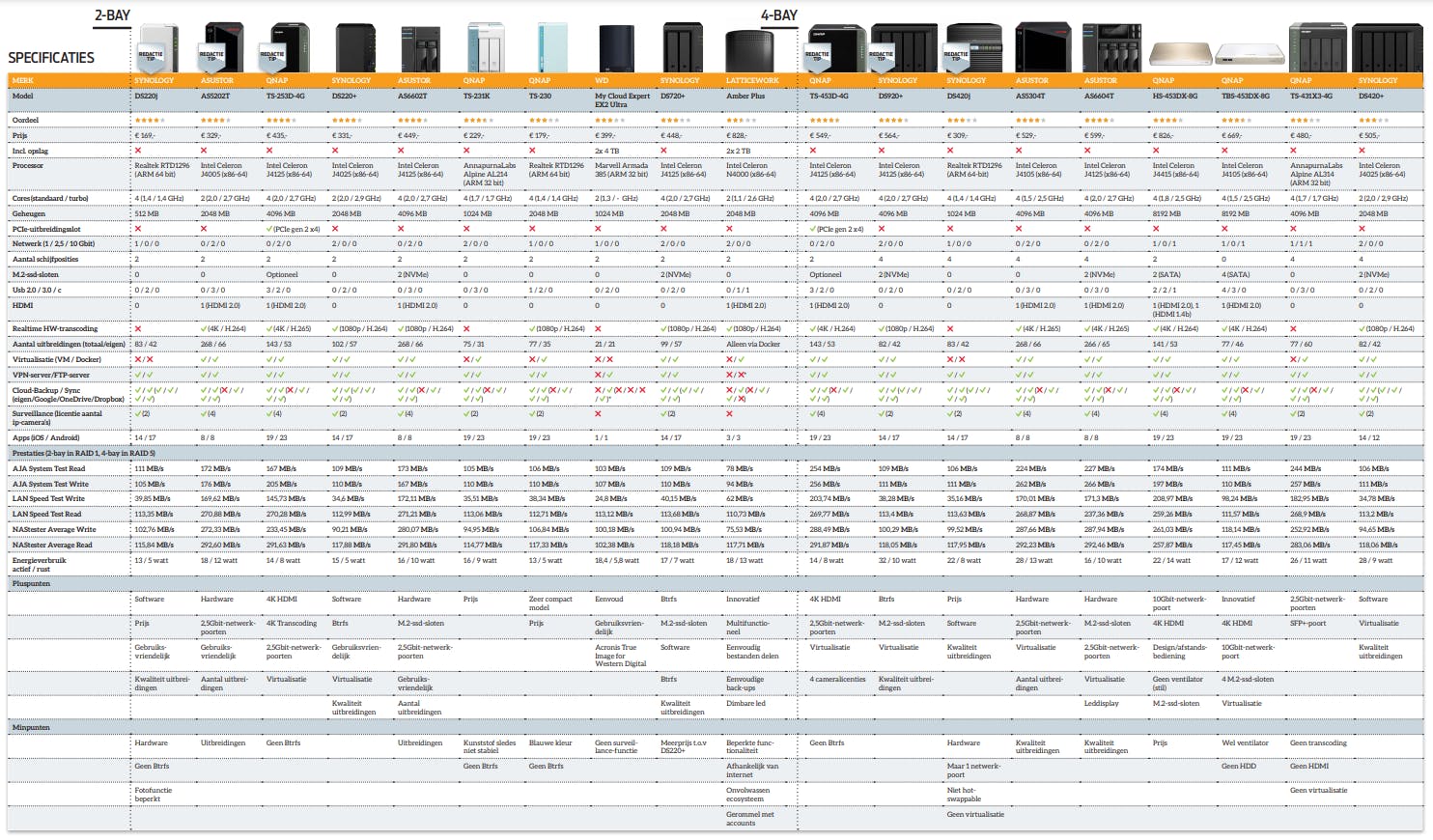 Helaas afwezig in deze test zijn Netgear en TerraMaster. De laatste debuteerde de vorige keer en viel toen op met lage prijzen voor lawaaiige aluminium behuizingen en het TOS-besturingssysteem dat net als de bijbehorende apps nog niet af was, maar wel stabiel functioneerde. TerraMaster verkiest voorlopig losse producttests boven vergelijkende tests met andere NAS-apparaten. Een ander merk dat ontbreekt is Netgear. Bij Netgear ‘heeft NAS momenteel niet direct de focus’ en zijn er daardoor geen updates van software of hardware. Daarom hebben wij afgezien van het (opnieuw) testen van Netgears NAS-modellen.
