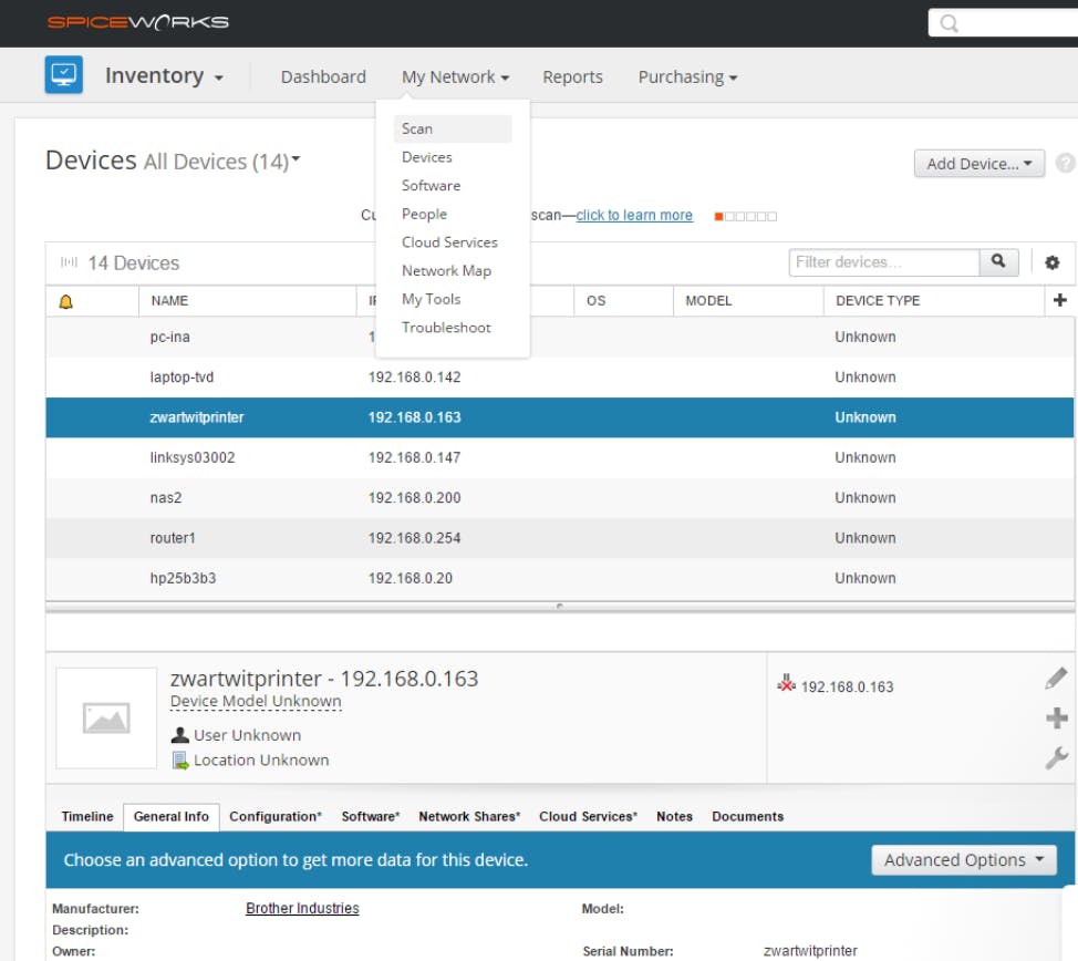 Spiceworks mag je gerust een complete netwerksuite noemen. Het programma is niet alleen in staat je netwerkapparatuur gedetailleerd te inventariseren, maar kan die tevens monitoren. Er zit zelfs een heuse helpdeskmodule bij, evenals een mdm-tool (mobile device management). Spiceworks laat zich vanuit een geïntegreerde webserver bedienen, maar werkt wel agentless: je hoeft dus geen clientmodule op je netwerktoestellen te installeren. Spiceworks verklapt je onder meer actieve services, geïnstalleerde software, hotfixes tot zelfs de status van printertoners. Er zijn ook uitgebreide rapporteringen en je krijgt zelfs een bericht als bijvoorbeeld een schijf is volgelopen of een antiviruspakket verouderd is.