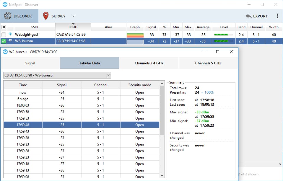 Wanneer je draadloze verbinding nukkig begint te doen, zou het best kunnen dat een buurman een overlappend kanaal gebruikt. NetSpot somt realtime alle draadloze netwerken in de buurt op. De tool vermeldt alle belangrijke gegevens van de gedetecteerde netwerken: (b)ssid, signaalsterkte, het wifi-spectrum (2,4 of 5 GHz), de netwerkmodus (802.11x), de beveiliging (open, wpa2 personal, etc.), de kanaalbreedte en het kanaal. Op basis van dit laatste kun je eventueel overwegen zelf een ander kanaal via je draadloze router in te stellen. De betaalde versie van NetSpot biedt tevens een site survey-module aan.