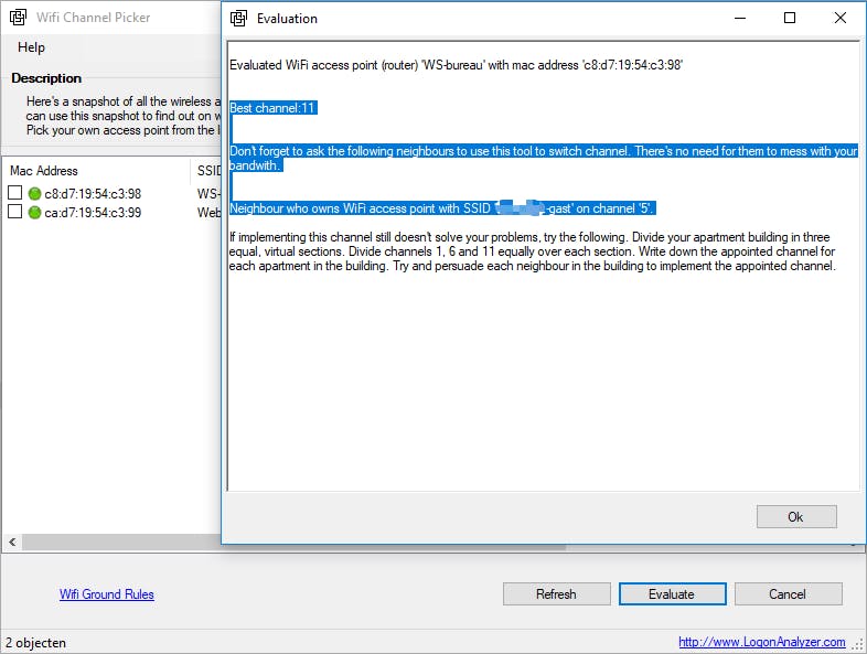 Werk je binnen het 2,4GHz-spectrum en blijkt de omgeving drukbevolkt met allerlei draadloze netwerken, dan is het vaak lastig om het meest geschikte kanaal voor je eigen netwerk te vinden. WIFI Channel Picker is een tool die er specifiek op is gericht het ideale kanaal aan te geven. De tool houdt daarbij niet alleen rekening met overlappende kanalen, maar ook met het ingebouwde mechanisme (csma/ca) waarmee draadloze routers of toegangspunten verschillende signalen over een gedeeld kanaal proberen te verwerken. Na een druk op de knop krijg je inzicht in de gemotiveerde beslissing van het programma.