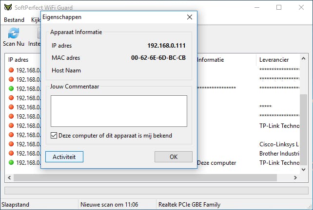Je hebt je draadloze netwerk goed afgeschermd met behulp van wpa2-encryptie, maar je vermoedt toch dat een niet-geautoriseerd apparaat zich af en toe met je netwerk verbindt. Dan is het zinvol een tool als Softperfect WiFi Guard in te zetten. Je laat je netwerk scannen en geeft daarbij aan welke toestellen vertrouwd zijn. Vervolgens stel je de frequentie in waarmee de tool nieuwe scans moet uitvoeren. Detecteert die daarbij nieuwe apparaten, dan kun je een alarm laten horen, een programma laten uitvoeren of een e-mail laten sturen met informatie over de nieuw gedetecteerde toestellen. Voor detectie van meer dan vijf apparaten heb je een licentie nodig (€19,–).