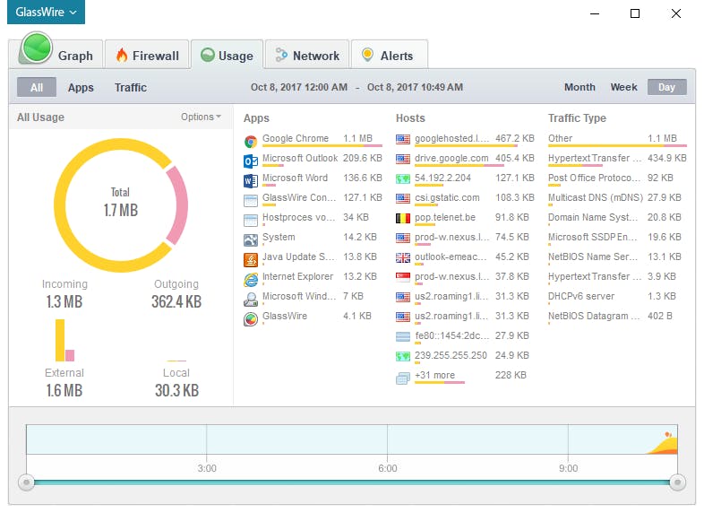 Ook met GlassWire kun je je (draadloze) netwerk laten monitoren en je op de hoogte laten brengen wanneer een apparaat je netwerk verlaat of er juist bijkomt. Maar GlassWire biedt nog heel wat andere opties. Je kunt namelijk verschillende onderdelen van je netwerk laten monitoren, bijvoorbeeld wanneer je computer een bepaalde bandbreedte van een specifiek type overschrijdt binnen een zekere periode. Of je leest af hoeveel binnenkomend en uitgaand verkeer er door je netwerkadapters is gegaan. GlassWire biedt tevens een soort grafische schil rond de Windows Firewall, zodat je met één muisklik een bepaalde toepassing kunt blokkeren.