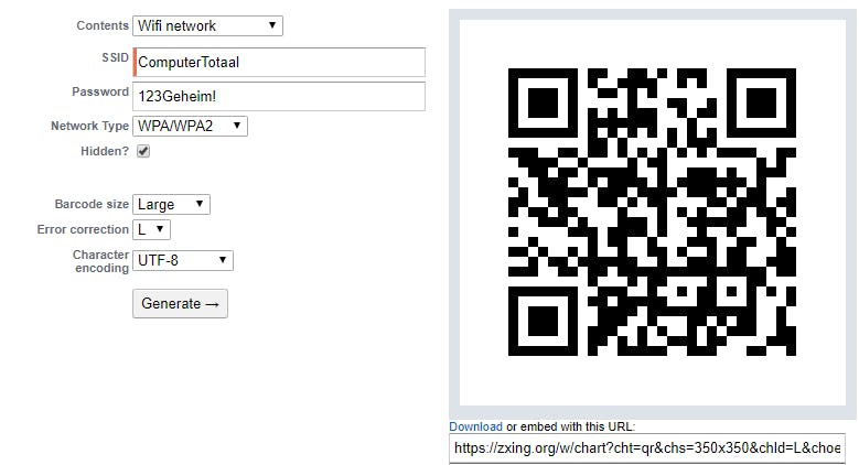 Je hebt je draadloze netwerk beveiligd met een wpa2-wachtwoord. Verstandig, maar wel vervelend wanneer je je gasten ook toegang wilt geven. Is een gastnetwerk geen optie op je router, dan kun je je behelpen met een qr-code die het ssid en het bijhorende wachtwoord bevat. Dat kan met de online generator van Zxing, waarbij je in het uitklapmenu dan wel eerst kiest voor Wifi network. Je kunt de code vervolgens afdrukken, waarna je bezoekers die met hun qr-app scannen. Die krijgen dan meteen toegang tot je netwerk, zonder het wachtwoord te zien.