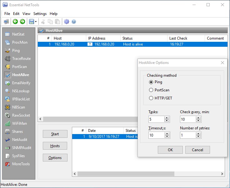 Een thuisnetwerk is handig, zolang er niets fout loopt. Gebeurt dat toch, dan is het wel zo prettig om enkele netwerktools bij de hand te hebben om je (draadloze) netwerk te monitoren en te testen. Essential NetTools is precies zo’n suite. Elke tool is direct via een knop bereikbaar. Je vindt hier obligate klassiekers als TraceRoute, Ping, NetStat en Portscan, maar er zijn er nog veel meer, zoals HostAlive (dat periodiek nagaat of een toestel of service nog bereikbaar is), NSLookup voor het uitvoeren van dns-queries en WiFiMan, dat de draadloze adapters en beschikbare wifi-netwerken weergeeft.