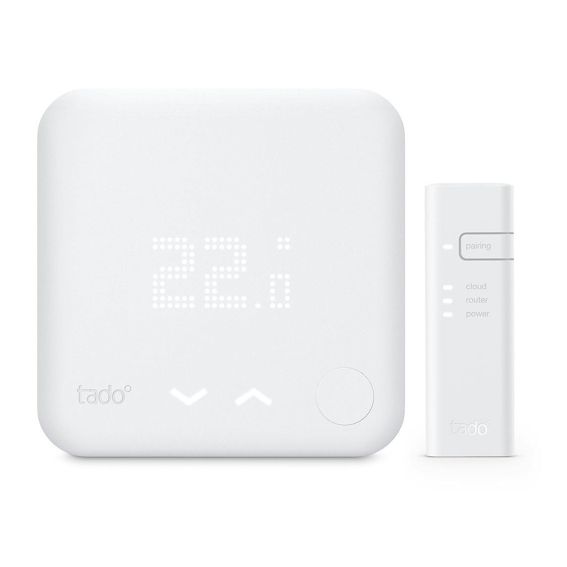 De Tado° V3(+) is een slimme thermostaat van Duitse makelij. Gekoppeld aan Google Assistent kan je met je stem onder andere de thermostaat hoger en lager zetten. Tado verkoopt ook aparte radiatorknoppen.
