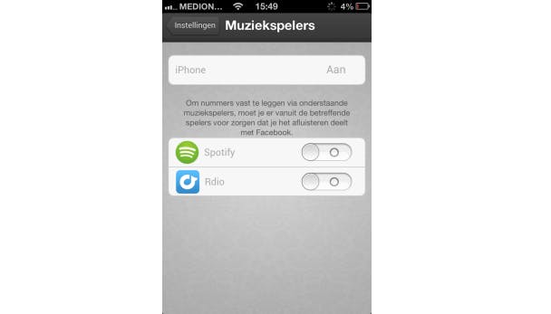 Ook kun je vrienden toevoegen aan de app zodat de muzieksmaak van je vrienden ook aan jou wordt gepresenteerd. Niet alleen liedjes die je met de interne muziekspeler speelt, worden geanalyseerd, je kunt je in de app ook aanmelden bij Spotify of Rdio door op het tandwiel te tikken en onder Muziekspelers op Spotify en Rdio te tikken. Zet de schuif achter Spotify of Rdio aan. Dit werkt alleen als je in de desbetreffende diensten hebt ingesteld dat je jouw luistersessies deelt met Facebook.