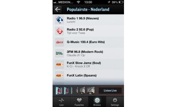 De beste app om radio mee te luisteren, is ongetwijfeld TuneIn Radio. Deze gratis app biedt je duizenden livestreams van radiostations over de hele wereld. Ook Nederlandse stations zijn goed vertegenwoordigd. Door te tikken op Op locatie en vervolgens voor Europa / Nederland te kiezen, heb je toegang tot onder andere 3FM, Q-Music, Radio 1 en BNR. Druk op een station en de livestream wordt meteen afgespeeld. Informatie over het actuele programma is ook meteen af te lezen.