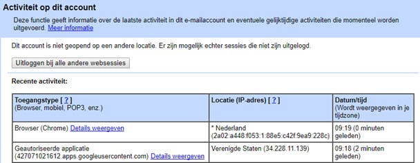 Als je hier bijvoorbeeld de Verenigde Staten ziet staan (zoals in ons geval), schrik dan niet meteen, het betekent niet (direct) dat je gehackt bent. Diensten die je toegang hebt gegeven tot je account (denk aan to-do-apps, Pokémon Go, etc), worden hier ook in getoond. Klik op Details als je twijfelt over een bepaalde waarde. Je kunt nu bij alle diensten uitloggen door te klikken op Uitloggen bij alle andere websessies. Je bent nu in één klap overal uitgelogd. Houd er rekening mee dat je dan wel weer opnieuw in moet loggen bij diensten die Gmail gebruiken (zoals de hiervoorgenoemde diensten).