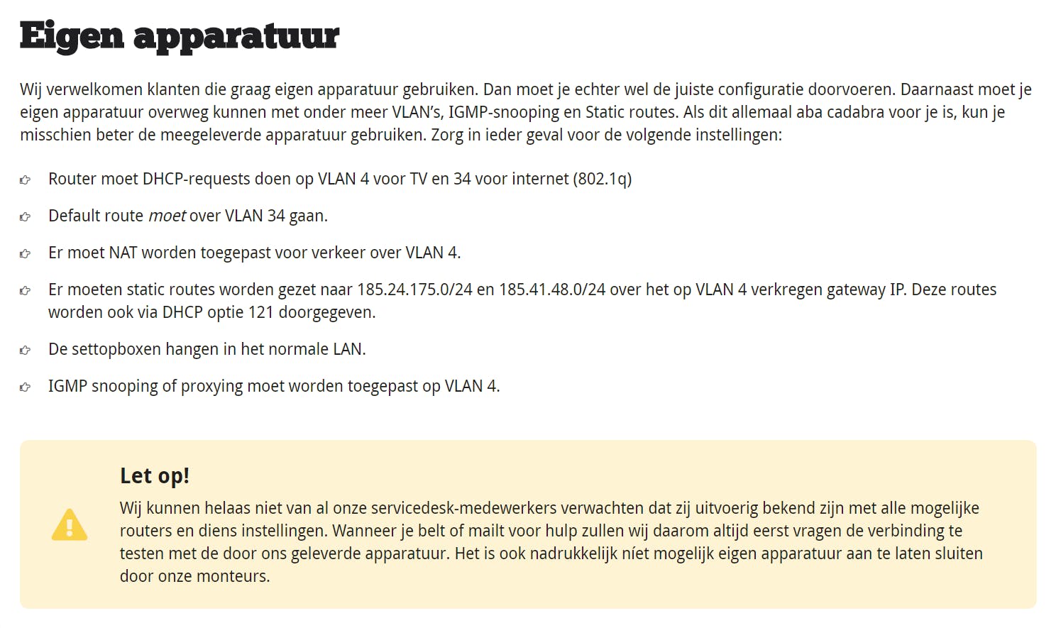 Delta biedt voor zover bij ons bekend geen vrije modemkeuze. Tweak doet dat wel. De provider geeft duidelijk aan wat hier de voor- en nadelen van zijn, zet de verschillende modellen op een rij en meldt in hoeverre ze geschikt zijn om naar eigen wens in te stellen. De provider waarschuwt wel dat eigen apparatuur zelf geïnstalleerd moet worden en dat niet alle servicemedewerkers je goed kunnen helpen als je eigen apparatuur gebruikt. KPN doet dat overigens ook.