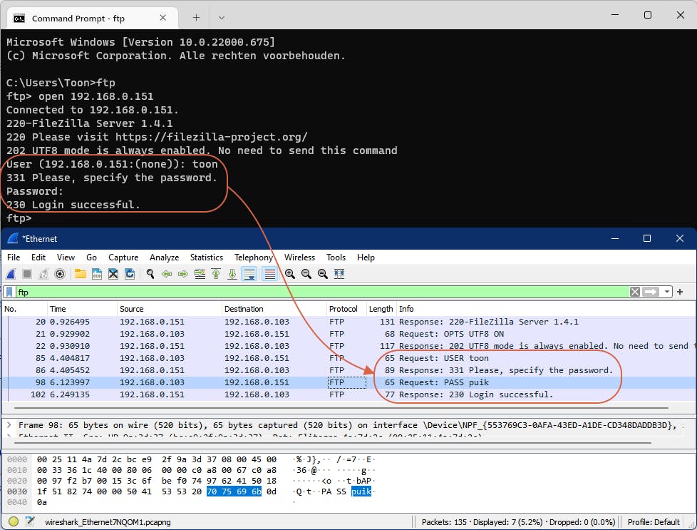 Een wat omslachtige methode dus, maar erger nog is de inherente onveiligheid. Immers, de server kan wel zo worden geconfigureerd dat een gebruikersnaam en wachtwoord zijn vereist, maar deze inloggegevens, evenals de eigenlijke data die naderhand worden doorgestuurd, gaan onversleuteld over het netwerk. Je kunt dit makkelijk zelf testen. In Windows bijvoorbeeld zet je snel een FTP-server op, bijvoorbeeld met FileZilla-server, waarna je aan clientzijde op een opdrachtregel het commando ftp uitvoert, gevolgd door de volgende commando’s: