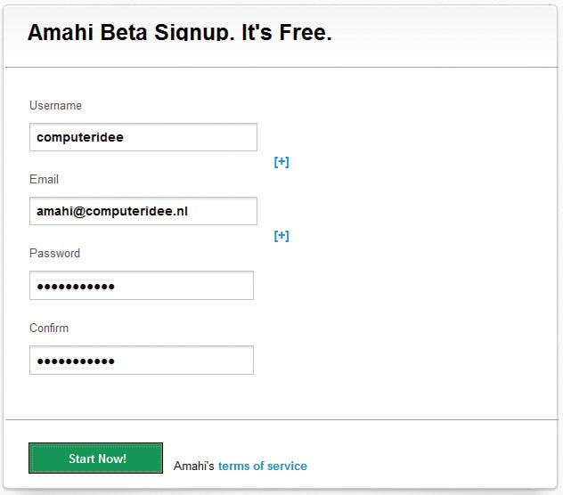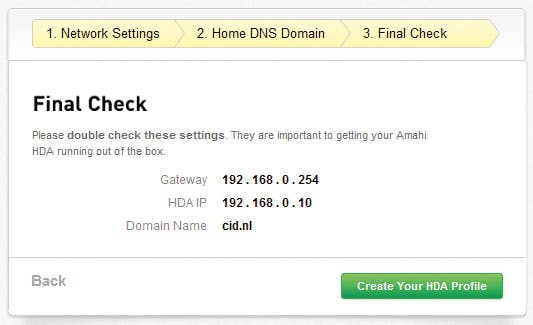 U meldt zich eerst aan op www.amahi.org. Hier klikt u op Get started now, waarna u de gevraagde gegevens invult. Bevestig met Start now. Enkele minuten later ontvangt u dan een bevestigingsmail. Open het bericht en klik op de link. U belandt nu op een webpagina met de knop Configure your HDA (Home Digital Assistant).