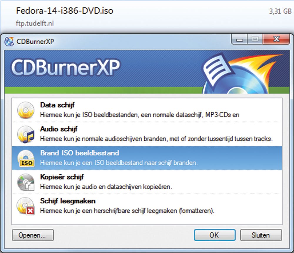U ziet hier meteen ook de minimale systeemvereisten voor uw Amahi Home Server, en dat valt best mee: 1 GHz-processor, 4 GB vrije schijfruimte en 512 MB ram (méér mag altijd!). Download nu Fedora 14: dat kan via de link download mirrors. Kies als downloadlocatie bij voorkeur NL en klik op de link http, daarna op de map releases en ga voor 14 (Amahi werkt momenteel niet goed samen met Fedora 15). Klik de mappen Fedora, i386 en iso aan. Een download van circa 3,31 GB verder en het bestand Fedora-14-i386-DVD.iso is binnen. Dit bestand brandt u vervolgens naar een (lege) dvd. Dat kan bijvoorbeeld met het gratis CDBurnerXP (cdburnerxp.se), waar u dan Brand ISO beeldbestand aanklikt en naar het iso-bestand verwijst.