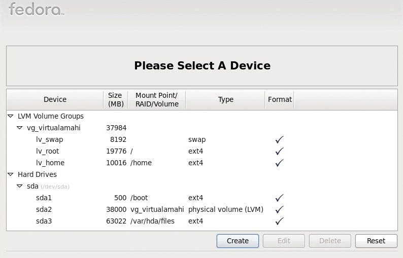 Er zijn wel nog een paar aandachtspunten. Selecteer het juiste toetsenbord (meestal is dat US of US internationaal). De taal kunt u eventueel op English ingesteld laten, zodat de voorbeeldschermen uit de instructies overeenkomen met wat u op het scherm ziet. Let vooral goed op bij het instellen van schijfpartities: zorg er met name voor dat u in het betreffende venster een vinkje plaatst bij ‘De partitie opmaak bekijken en aanpassen’ zodat u de voorgestelde aanpassingen kunt uitvoeren. Als alles goed is, is uw harde schijf ongeveer ingedeeld zoals in de afbeelding 4. De exacte volumegroottes hangen natuurlijk wel af van de grootte van uw eigen schijf. Wat de swap-partitie betreft: die maakt u het liefst minstens dubbel zo groot als de hoeveelheid ram-geheugen op uw systeem. Tegen het einde van de installatie dient u de Amahi-software (‘repository’) te downloaden (via de url f14.amahi.org).