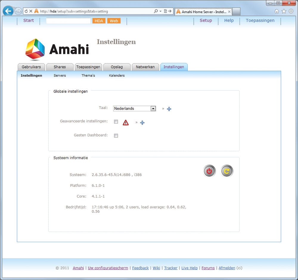 Na de herstart en uw aanmelding bij Fedora, dubbelklikt u op Amahi HDA Setup, waarna u zich aanmeldt met hetzelfde gebruikersaccount als Fedora (eventueel wijzigt u het wachtwoord). U belandt nu op het ‘dashboard’ van uw Amahi-server. Dat kan vanaf nu trouwens ook door op een van uw netwerk-pc’s de browser op http://hda af te stemmen. Hier klikt u nu op Setup en stelt u op het tabblad Settings de taal op Nederlands in.
