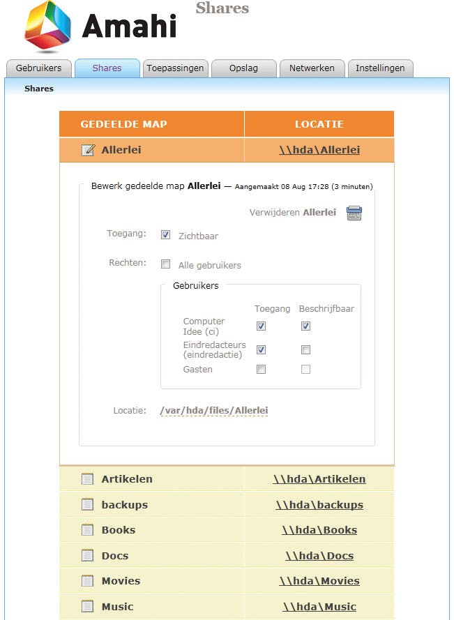 Hoog tijd nu om iets met uw server te doén… Laten we beginnen met het instellen van shares, gedeelde mappen dus. Open hiervoor opnieuw de setup-pagina en ga naar het tabblad Shares. U merkt dat er al een aantal shares gecreëerd werden, waaronder Docs, Music, Pictures en Movies. Die hoort u nu al te kunnen bereiken vanaf uw netwerk: start de Verkenner op en tik in de adresbalk bijvoorbeeld \\hda\music in. De gedeelde map is uiteraard nog leeg, maar u kunt hier gerust al enkele bestanden naar kopiëren. Een nieuwe share creëren is niet moeilijker dan op de knop Nieuwe gedeelde map te drukken, een geschikte naam in te vullen – het juiste pad wordt in principe automatisch ingevuld: /var/hda/files/<naam_van_share>) – en al dan niet het vinkje te laten staan bij Zichtbaar (indien niet zichtbaar moet u in de Verkenner zelf het juiste pad kennen en invoeren) en bij Alleen lezen. Bevestig met Creëer de gedeelde map. Klik op de nieuwe share als u die nog wil bewerken. U kunt hier dan bijvoorbeeld het vinkje weghalen bij Alle gebruikers en aangeven welke gebruikers welke toegang krijgen. Nieuwe gebruikers maakt u logischerwijze aan op het tabblad Gebruikers.