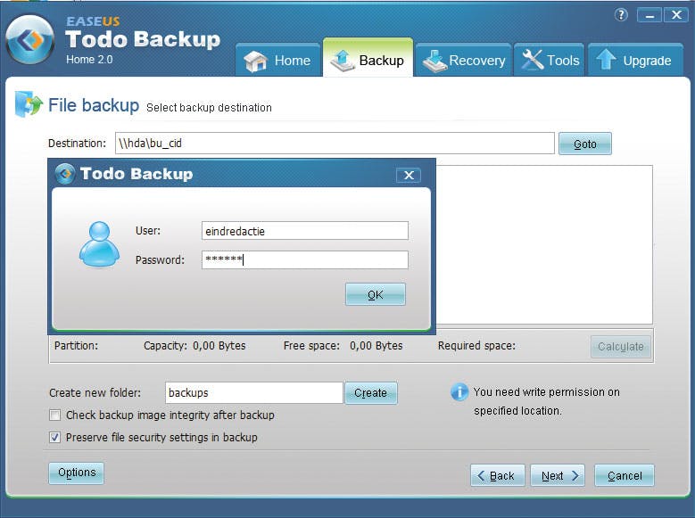 Het is nu een kleine stap naar het maken van backups naar zo’n share op uw server – iedere gebruiker kan bijvoorbeeld over een eigen backup-share beschikken (waar alleen hij rechten toe krijgt). Laten we de veelzijdige en gratis backup-software Easeus Todo Backup (www.todo-backup.com/products/home) als voorbeeld nemen. Installeer die op een van uw Windows-pc in het netwerk. Start de tool, open het tabblad Backup en kies (bijvoorbeeld) File backup. Voorzie een geschikte naam en duid de gewenste gegevens aan. Bij Destination vult u vervolgens \\hda\<share-naam-voor-backups> in en drukt u op de Enter-toets; soms doet Todo Backup wat nukkig en moet u dat een paar keer herhalen. Vul de gebruikers-id in die u in Amahi schrijfrechten hebt toegekend op die share. In het volgende venster geeft u dan de gewenste timing voor uw back-ups in en met Proceed begint de backup – indien u Now had geselecteerd.