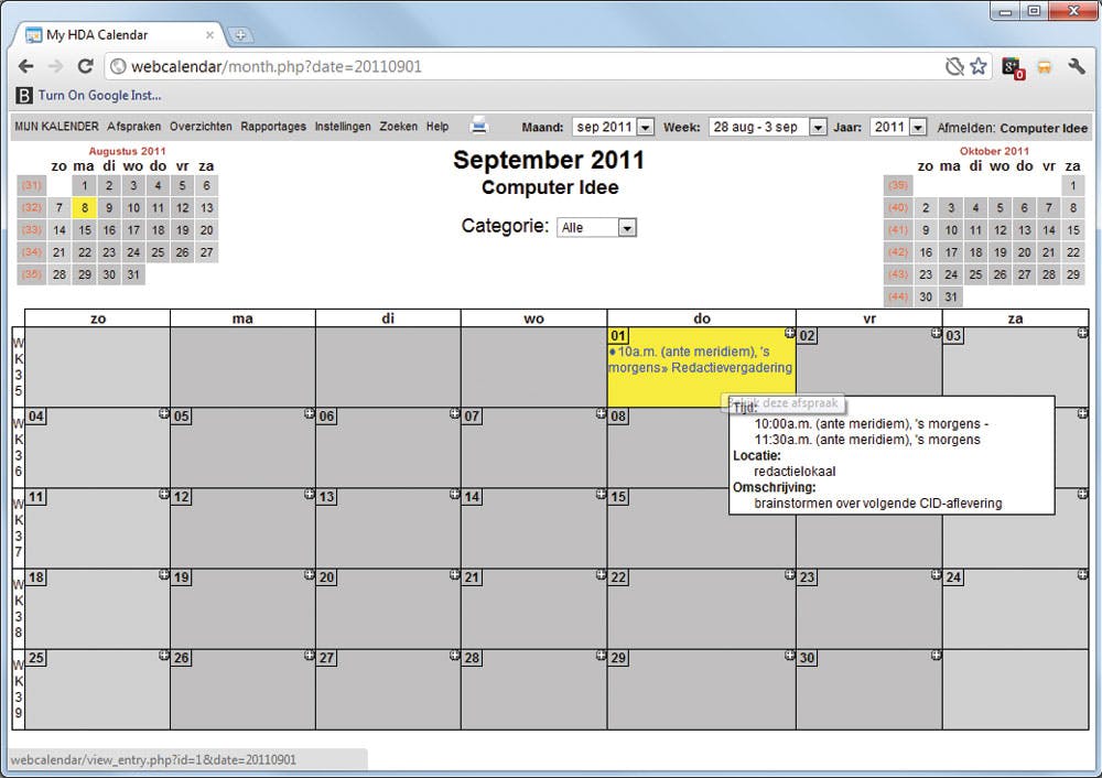 Het bijhouden van ‘gecentraliseerde kalenders’ via Amahi is eenvoudig. Ga naar uw dashboard, klik op Setup en open het tabblad Toepassingen. Naast een hele reeks thema’s voor uw server (selecteer een thema, klik op Install, open het tabblad Instellingen, klik op Thema’s en klik het gewenste thema aan) treft u hier ook verschillende nuttige toepassingen aan. Kies WebCalender en selecteer Install. Na de installatie komt u te weten dat u hiervoor moet inloggen op http://webcalendar en dat de eerste gebruiker standaard admin is (met wachtwoord admin). Ga met uw browser naar dat adres en meld u als admin aan: u kunt nu meteen uw afspraken vastleggen. Het is prima mogelijk een agenda te voorzien voor verschillende gebruikers: klik hiervoor op Instellingen en Gebruikersbeheerder. Via de link Gebruiker toevoegen maakt u alle gewenste gebruikers aan. Afhankelijk van wie zich bij http://webcalendar aanmeldt, wordt de bijhorende agenda getoond.