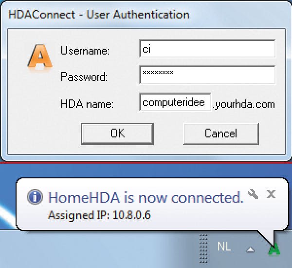 Wij nemen de Windows-versie als voorbeeld. Download en installeer de tool (als administrator). Na de installatie start u – op een pc die zich buiten uw netwerk bevindt – het programma HDAConnect op. Klik met de rechtermuisknop op het nieuwe icoontje in het Windows-systeemvak en kies Connect. Vul het gebruikers-id van uw server in en vul de juiste HDA-naam in (die vindt u desnoods via www.amahi.org/user). Zodra u op Connect drukt, wordt de verbinding gelegd. U kunt nu ook op die pc via de Verkenner naar \\hda bladeren of naar http://hda, http://webcalendar enz. surfen – net alsof u thuis bent en zonder gevaar voor pottenkijkers. Lukt de verbinding niet, dan moet u in uw router nog een poort forwarden naar het interne lan-adres van uw server (bijvoorbeeld: 192.168.0.10). Voor OpenVPN is dat poort 1194 (udp) en de kans is groot dat u op www.portforward.com de nodige instructies voor uw eigen router terugvindt.