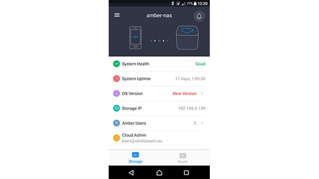 Nadat je akkoord bent gegaan met de privacy policy, wordt het besturingssysteem Amber OS gedownload. Daarna kun je zowel op de router als op het opslaggedeelte van de nas inloggen. Die eerste bevindt zich op ip-adres 192.168.8.1 (mDNS-naam latticerouter.local) en die tweede op een ander ip-adres met als mDNS-naam latticenode.local. Op de aanmeldpagina van de router staat ook een link naar de aanmeldpagina van de nas.