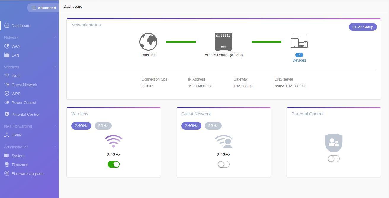 Als je in de router inlogt (wachtwoord admin1234) krijg je een sober dashboard te zien met de status van het netwerk van de Amber-router. Er staat standaard een wifi-netwerk ingesteld, en je kunt hier ook een gastnetwerk en ouderlijk toezicht instellen. Dat gastnetwerk heeft standaard hetzelfde wachtwoord als het normale wifi-netwerk, dus dat kun je het best aanpassen.