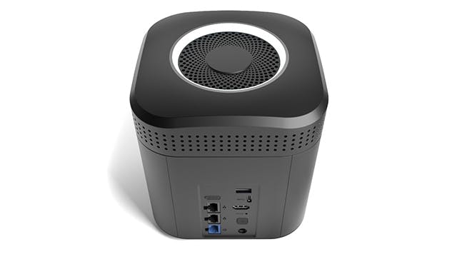De nas van LatticeWork is een opvallende verschijning: het is een redelijk kleine kubus met bovenaan een lichtgevende ring. Zowel de Amber One als amber Plus worden met twee harde schijven in raid1-opstelling geleverd. Het enige verschil is dat de Amber One schijven van 1 TB heeft en de Amber Plus van 2 TB. Wij testen de Amber Plus.