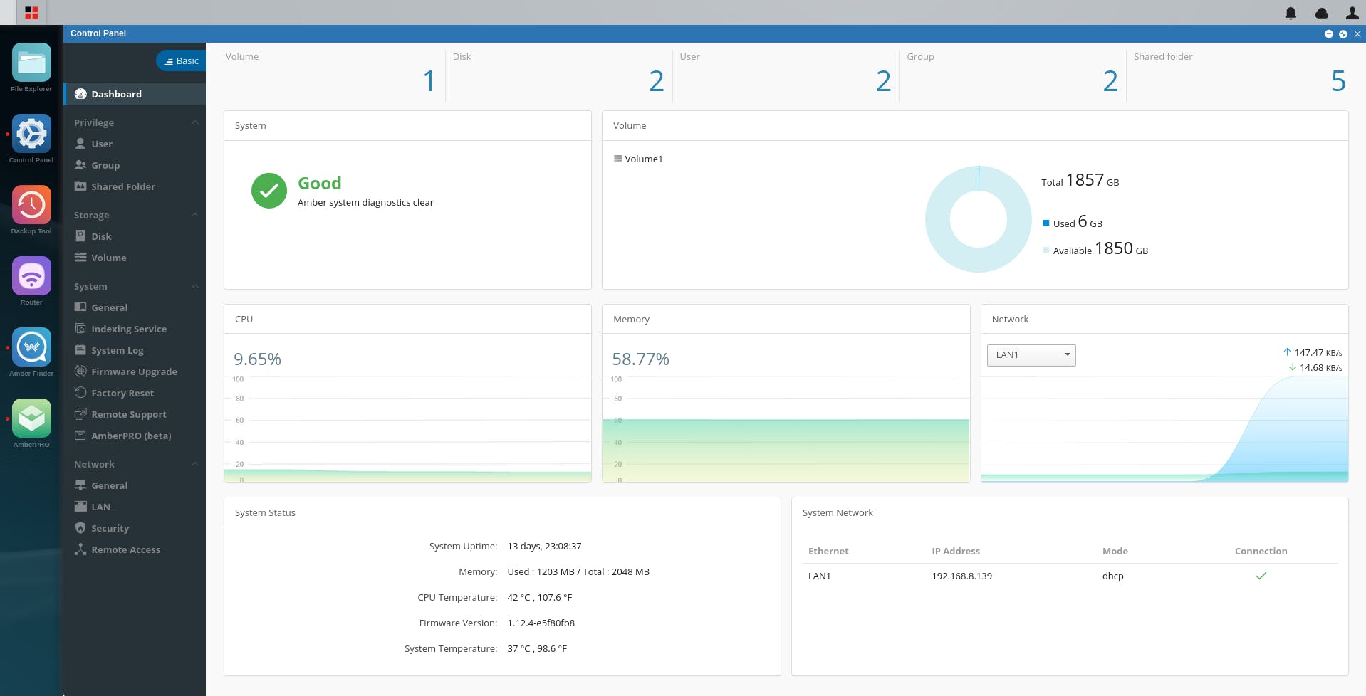 In het Control Panel maak je eenvoudig een gedeelde map aan. Die wordt dan in de File Explorer van de webinterface zichtbaar, en dan kun je lokale bestanden daarin verslepen. Tot deze gedeelde mappen krijg je dan eenvoudig toegang in Windows, macOS of Linux via Windows-bestandsdeling (Samba onder Linux). Je kunt mappen ook exporteren om ze via de Amber LiFE-app te delen met mobiele gebruikers, waar ze zich ook bevinden. Er is overigens ook nog een programma Amber Desktop voor Windows en macOS voor toegang tot alle mogelijkheden van de nas.