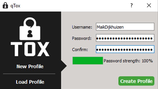 Start je qTox voor het eerst op, dan vraagt het programma om een gebruikersnaam en wachtwoord (2x). Vul de velden in en zorg ervoor dat er achter Password strength een score staat van 100 procent. Lees hier meer over sterke wachtwoorden.