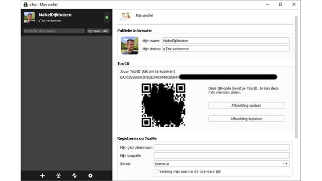 Logischerwijs heeft het gebruik van qTox alleen nut als je gesprekspartner eveneens dit programma (of een andere tox-client) gebruikt. Bij reguliere chatdiensten voeg je contactpersonen via een e-mailadres of mobiel nummer toe, maar met dit tooltje werkt dat net even anders. Iedere gebruiker beschikt namelijk over een unieke tox-id. Dat is een code van 76 karakters waarmee leden van qTox elkaar kunnen toevoegen.