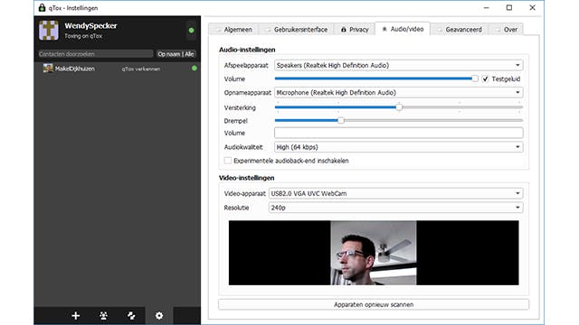 Wanneer je wilt videobellen, selecteer je achter Video-apparaat een aangesloten webcam. Er verschijnt als het goed is direct beeld. Wijzig indien nodig bij Resolutie de waarde om de beeldkwaliteit te verbeteren. Herkent qTox bepaalde randapparatuur niet? Probeer in dat geval onderaan de optie Apparaten opnieuw scannen eens uit.