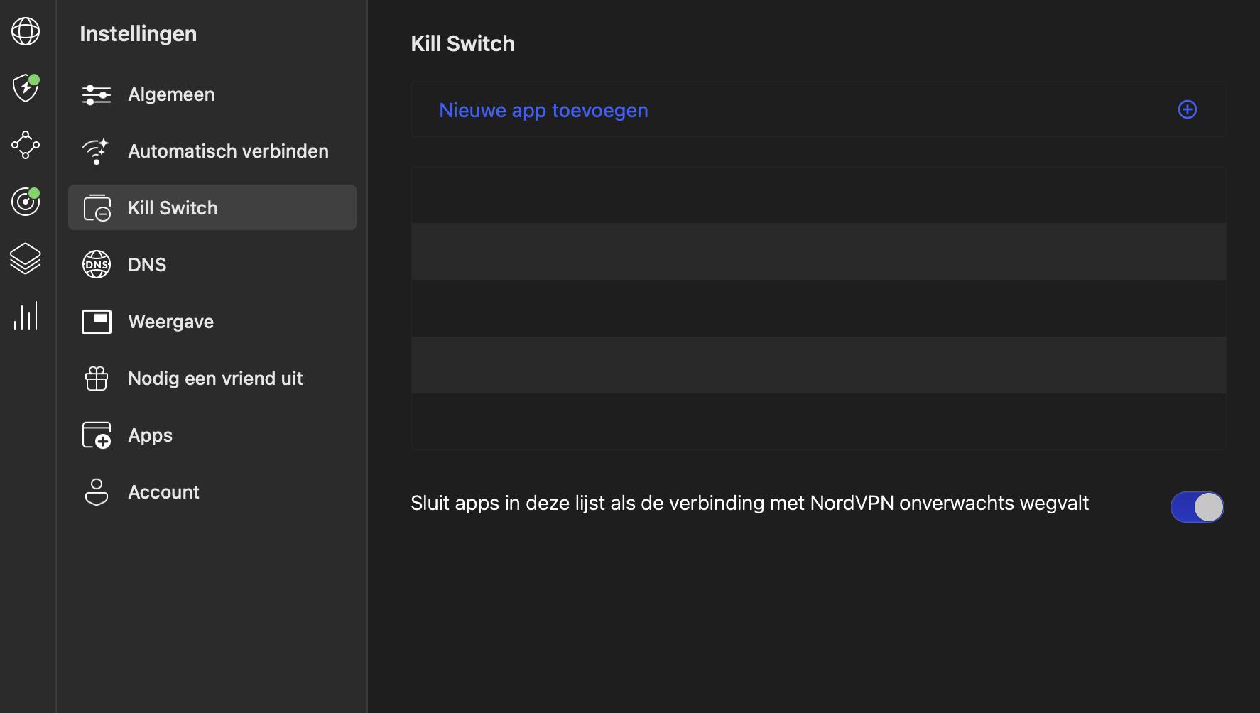 Een killswitch blokkeert al het internetverkeer zodra de VPN uitvalt. Dat voorkomt dat je verbinding onbeschermd doorgaat. Activeer dit in je VPN-app via Instellingen en Killswitch, of op je Android-apparaat via Instellingen / Verbinding en delen / VPN, en vervolgens gebruik je de slider bij Alle verbindingen die geen VPN gebruiken blokkeren bij de VPN die je gebruikt.