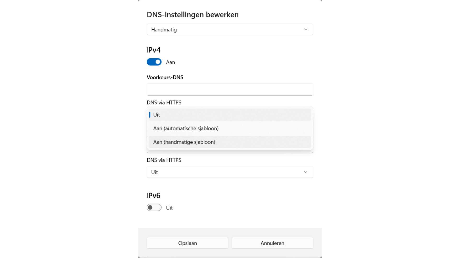 Dat kun je oplossen door in je VPN-app DNS leak protection te activeren of door op Windows 11 versleutelde DNS te forceren via Instellingen / Netwerk en internet. Kies je verbinding en dan DNS-server toewijzing / Bewerken / Handmatig, de slider bij IPv4 of IPv6 aan te zetten en DNS via HTTPS op Aan te zetten.