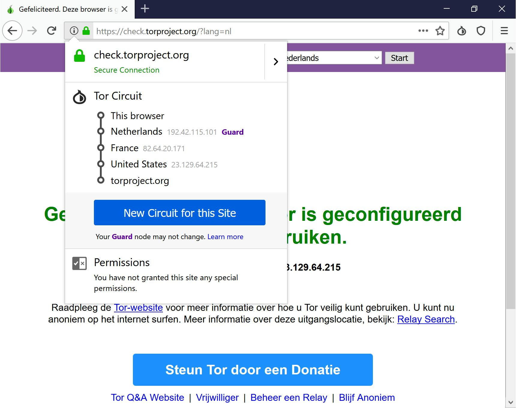 Met een klik op New Circuit for this Site verander je de keten voor een website. Dat is handig als het laatste relais in de keten de website om een of andere reden niet kan bereiken. Merk op dat de Tor Browser het eerste relais, de ‘guard node’, slechts om de twee tot drie maanden verandert: uit onderzoek is gebleken dat dit veiliger is dan ze telkens te veranderen.