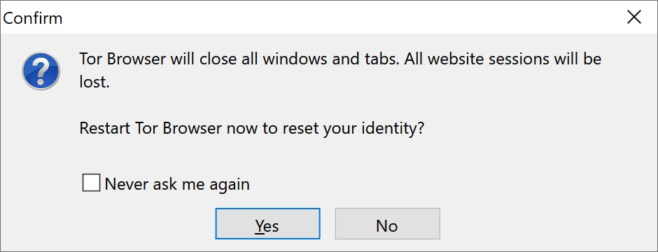 Nog drastischer is de optie New Identity, die je in het menu vindt (pictogram met de drie horizontale streepjes rechtsboven) of onder het icoontje van de ui in de werkbalk. Dit is de ‘nucleaire optie’ voor je anonimiteit, waarmee je voorkomt dat iets uit je browseractiviteit daarna nog te linken is aan je activiteiten ervoor. De Tor Browser sluit dan al je tabs en vensters, wist alle privé-informatie zoals cookies en browsergeschiedenis, en gebruikt nieuwe Tor-ketens voor alle verbindingen. Eventuele downloads die nog aan de gang zijn, worden ook afgebroken.