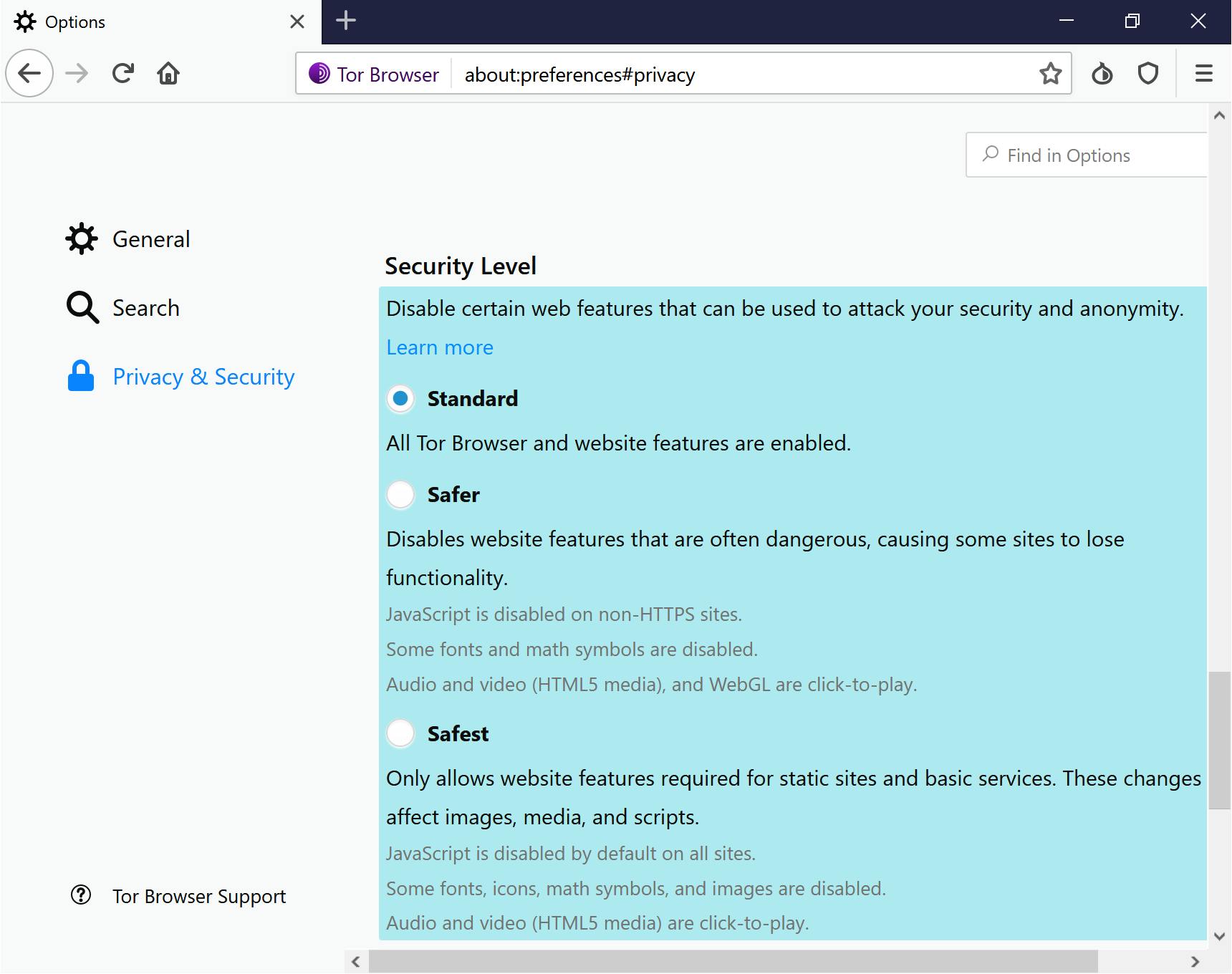 Op het standaardniveau verloopt alle communicatie via het Tor-netwerk, maar legt de Tor Browser websites niets in de weg: zo blijft javascript gewoon werken. Je ip-adres is dan wel verborgen, maar je lekt waarschijnlijk nog heel wat informatie op de achtergrond. Kies je voor Safer, dan wordt javascript op websites zonder https uitgeschakeld, sommige lettertypes en wiskundige symbolen worden niet meer geladen, en op audio en video dien je te klikken voor ze beginnen te spelen. Safest gaat nog verder: dit beveiligingsniveau schakelt javascript overal uit, en laadt ook icoontjes en afbeeldingen niet meer.