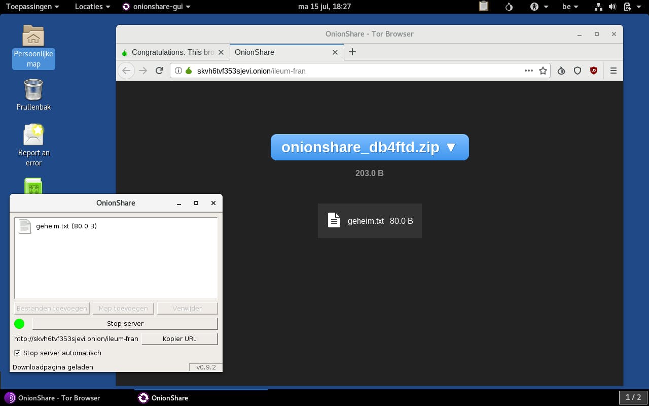 Ook kun je rechtstreeks in de bestandsbeheerder bestanden anoniem uitwisselen met OnionShare. Open Bestanden in Toepassingen / Accessoires, klik met rechts op een bestand of map en kies in het contextmenu Share via OnionShare. Als je dan op Start server klikt, start je automatisch een onion service. Na een tijdje krijg je een willekeurig gegenereerd onion-domein te zien. Deel dit met de persoon waarmee je de bestanden wilt delen en die hoeft dit domein maar in de Tor Browser te bezoeken om je bestanden te downloaden. Volledig anoniem en end-to-end versleuteld.