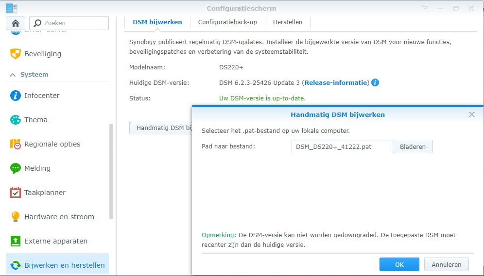 Ga je overstag, sla het downloadbestand dan ergens op je pc op. Open vervolgens het Synology Configuratievenster en kies Bijwerken en herstellen (hier lees je trouwens ook je huidige DSM-versienummer af). Klik op Handmatig DSM bijwerken en verwijs naar het gedownloade bestand. Bevestig met OK / Volgende / Ja. Na pakweg tien minuten is DSM weer helemaal bij.