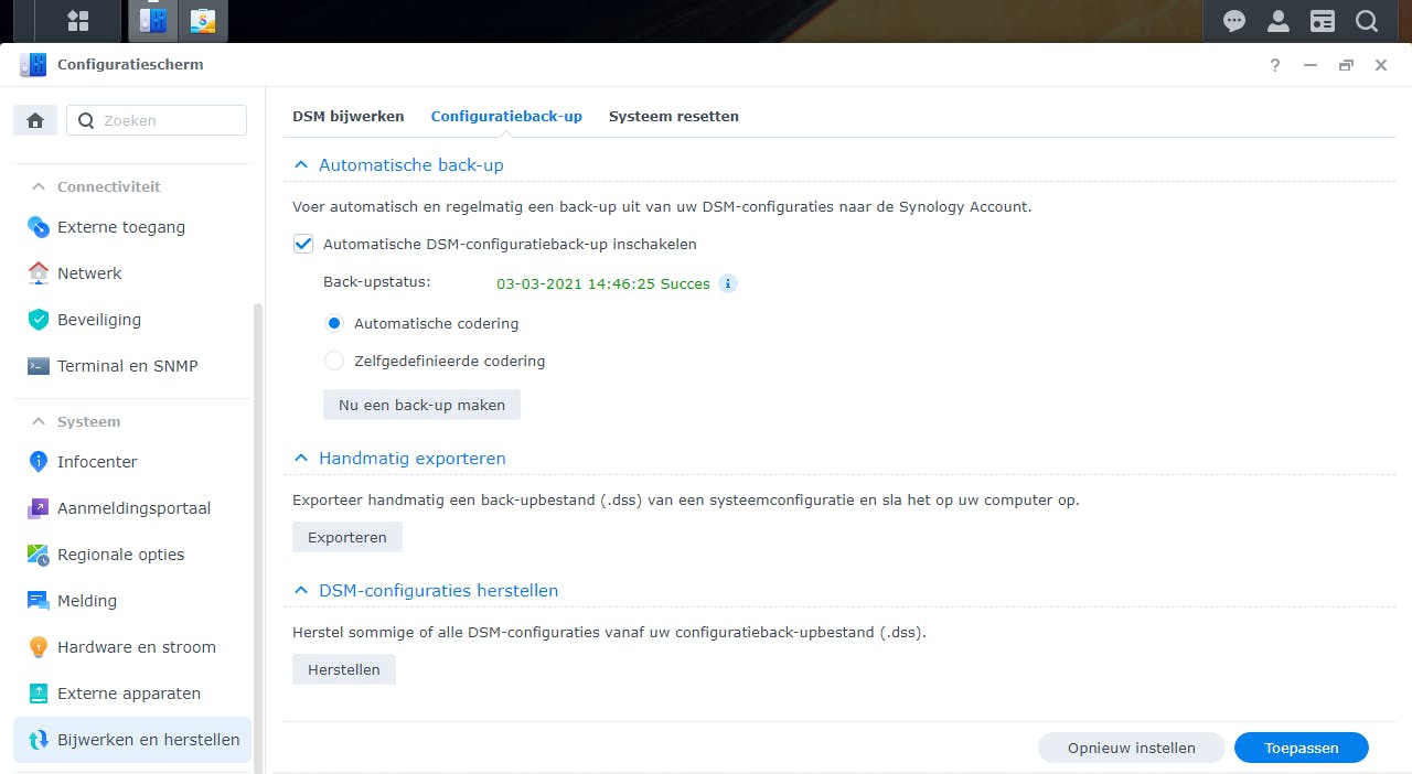 Het beste ga je ook nog even naar Configuratiescherm / Bijwerken en herstellen, waar je Configuratieback-up opent. Beschik je over een Synology-account, dan kun je hier kiezen voor Automatische DSM-configuratieback-up inschakelen. Of je klikt op Exporteren om je DSM-configuratie (ook) lokaal te back-uppen.