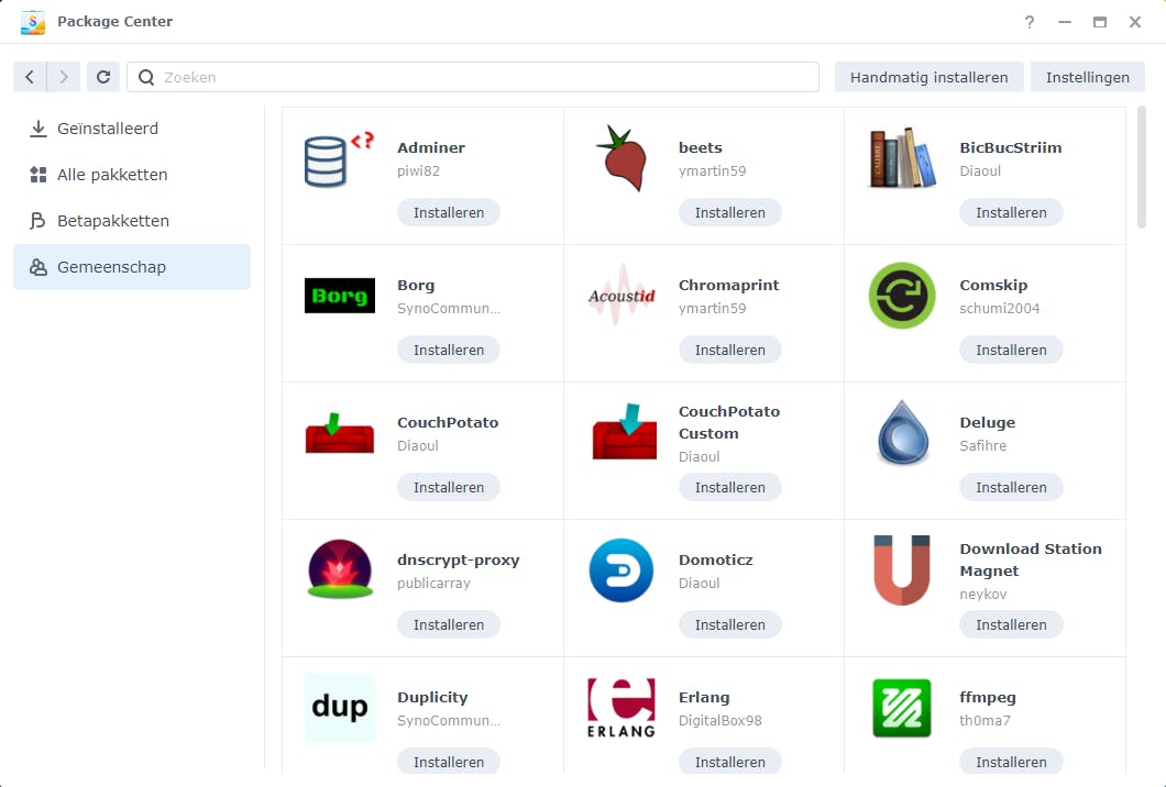 Mocht je een pakket op een of andere manier zelf al hebben gedownload, dan kun je dat in principe installeren door in het Package Center op de knop Handmatig installeren te klikken en naar het installatiebestand te verwijzen.