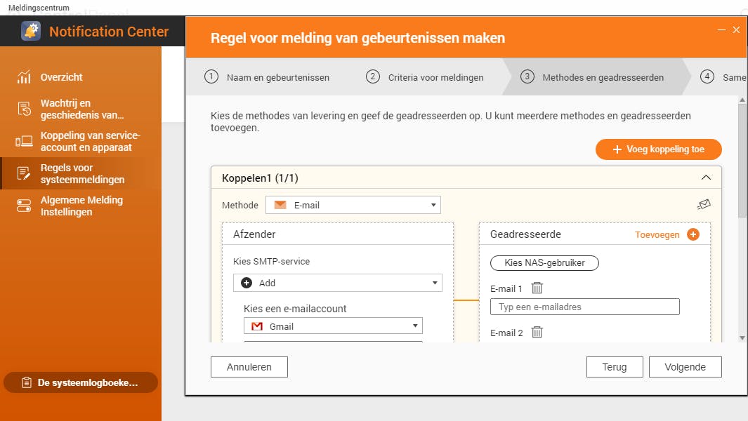 Om snel op de hoogte te zijn van dringende berichten, kun je het best gebruikmaken van het Meldingscentrum (klik linksboven op het hamburgerknopje of open Configuratiescherm / Systeem, en selecteer Meldingsscherm). Deze app laat je instellen welke berichten je wilt ontvangen en hoe dat moet gebeuren, bijvoorbeeld via e-mail. In dat laatste geval dien je wel eerst nog een SMTP-server te definiëren. Je kunt bijvoorbeeld Gmail of Yahoo selecteren, of via Aanpassen de nodige serverinstellingen invullen.