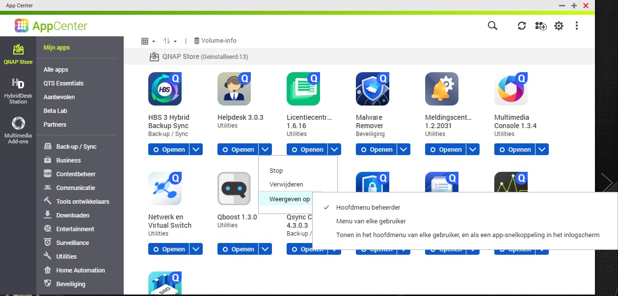 Je kunt deze apps hier meteen Openen. Ook kun je hier kiezen voor Stop om een app (tijdelijk) te onderbreken of een app definitief Verwijderen – voor zover deze opties beschikbaar zijn. Via Weergeven op bepaal je waar een app te zien moet zijn: in het Hoofdmenu beheerder of in het Menu van elke gebruiker.