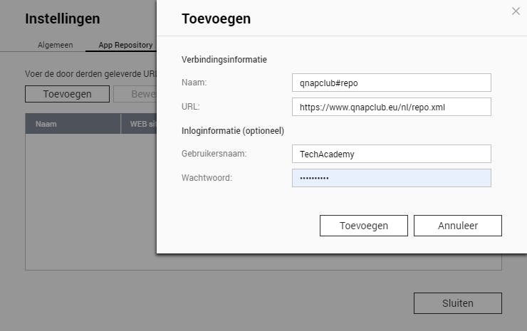 Een voorbeeld van een repository van een derde partij is bijvoorbeeld Qnapclub. Na een succesvolle registratie vul je achter URL de link https://www.qnapclub.eu/nl/repo.xml in, evenals je inloggegevens. Als dit is gelukt, dan vind je de nieuwe ‘repo’ terug in het linkerdeelvenster van je App Center, klaar voor het installeren van toepassingen.