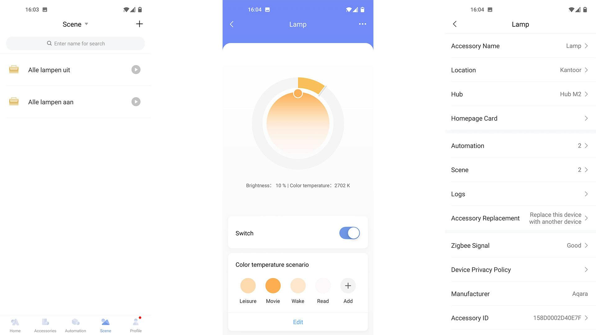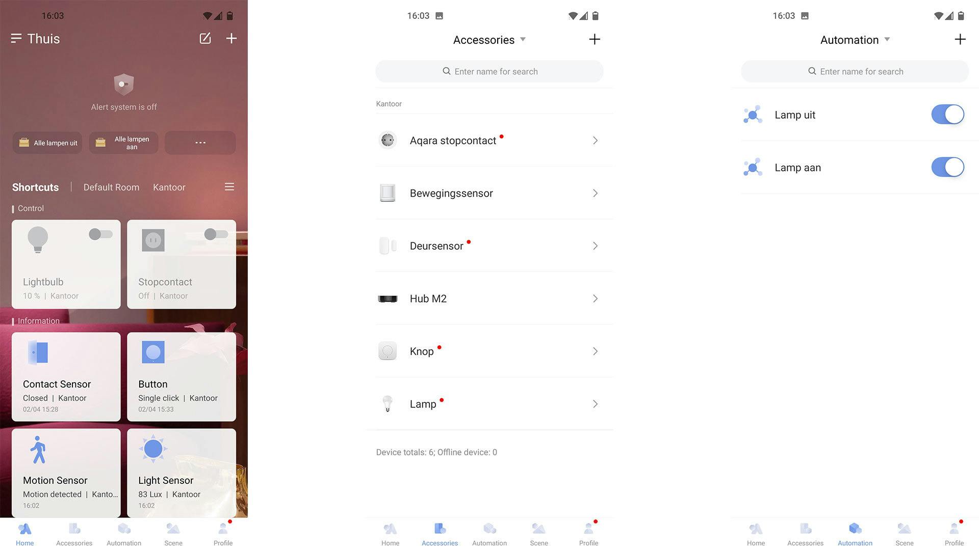 Het belangrijkste is echter dat het gewoon werkt en dat de app in alle gevallen overzicht biedt. De concurrentie kijkt nou eenmaal naar elkaar, dus is het niet vreemd dat echt goede aspecten overgenomen en binnen een eigen omgeving uitgewerkt en aangepast worden. Onderaan de app is een navigatiebalk met vijf opties: Home, Accessoires, Automation, Scene en Profile. Bij de derde optie kun je de automatiseringen regelen, bij optie twee installeer je de apparaten.