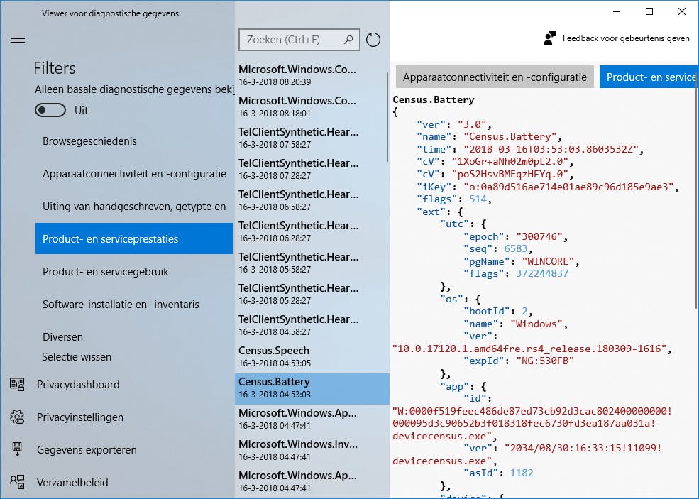 Microsoft is één van de eerste grote bedrijven die zichtbare wijzigingen in hun producten hebben aangebracht. De veranderingen zijn binnen Windows 10 al zichtbaar in het Windows Insider-programma, maar later zijn de nieuwe functies voor iedereen beschikbaar. Na de installatie komen enkele vragen tevoorschijn, waarbij je aangeeft in hoeverre je data met het softwarebedrijf wilt delen. Verder krijgt Microsofts besturingssysteem ook een functie om verzamelde diagnostische data te bekijken met de zogeheten Windows Diagnostic Data Viewer. Dit tooltje dien je via de Microsoft Store te downloaden. Na de installatie bereik je het hulpprogramma via Instellingen / Diagnostische gegevens en feedback / Viewer voor diagnostische gegevens. Gebruikers kunnen deze gegevens doorzoeken op trefwoord en op onderwerp filteren. Het gaat onder meer om specifieke eigenschappen van de pc of laptop, zoekopdrachten naar bestanden, getypte teksten en geïnstalleerde software. Vanuit het instellingenmenu wis je desgewenst de opgeslagen gegevens of sla je ze op.