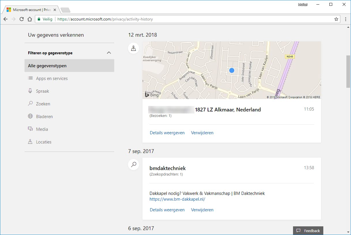 Een andere belangrijke maatregel van Microsoft is de uitbreiding van het privacydashboard, dat Windows Insiders al kunnen bereiken. Bij het onderdeel Activiteitenoverzicht zie je exact welke (persoons)gegevens er bij Microsoft bekend zijn. Dat is opvallend veel, zoals het woonadres en allerlei zoekopdrachten. Eventueel kun je op onderwerp sorteren en de gegevens verwijderen. Het privacydashboard bevat verder ook nog een downloadknop waarmee je de gegevens opslaat in een json- en/of mpeg-bestand.
