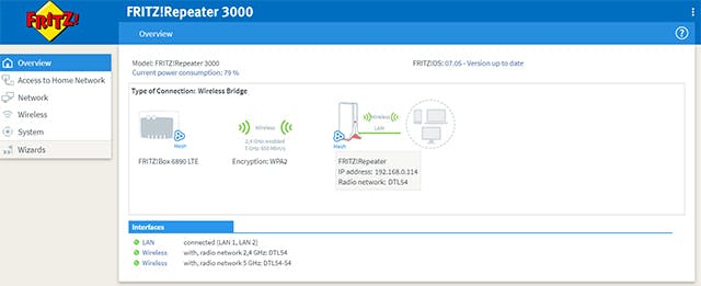 Het overzichtelijke webbeheer heeft de gebruikelijke interface van AVM-repeaters en -routers. Die interface werkt echter (nog?) niet in het Nederlands, hoewel sommige recente routers van AVM (zoals de in deze test gebruikte 6890 LTE) intussen wél een Nederlandse interface hebben.