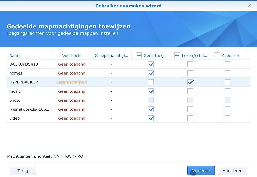Je maakt een gedeelde map trouwens aan via Configuratiescherm, Gedeelde map en Maken. Doorloop vervolgens de wizard; de opties spreken voor zich (en anders is er bij wat moeilijker zaken altijd uitleg te vinden via het vraagtekentje). Maak vervolgens een nieuwe gebruiker aan (Configuratiescherm, Gebruiker, Maken) die je alleen toegang geeft tot de net gemaakte gedeelde map. De wizard leidt je wederom door de procedure heen. Je doel-NAS is nu helemaal voorbereid.