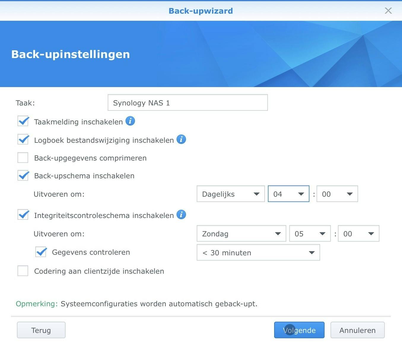Nu gaan we de ‘schakelklok’ van de back-up instellen. Het kan handig zijn om het logboek bestandswijziging aan te zetten; beschikt je doel-NAS over genoeg opslagruimte dan kan de back-up compressie uitgezet worden. Scheelt weer snelheid. Achter Back-upschema inschakelen selecteer je de gewenste back-upfrequentie. Dat kan bijvoorbeeld dagelijks zijn, op een door jou gewenst tijdstip. Of elk uur, gedurende de werktijd van bijvoorbeeld 09.00 uur tot en met 17.00 uur. Vanzelfsprekend worden gegevens die je eventueel buiten die uur-back-ups schrijft uiteindelijk ook gewoon meegenomen in de back-up, alleen dan pas weer bij de eerste geplande back-up om 09.00 uur. Zet ook de optie Integriteitscontroleschema inschakelen aan. Kun je gewoon een keer in de week in de nachtelijke uren plannen en heb je dus verder geen last van. Kies wel een tijdstip dat niet samenvalt met een eventuele geplande back-up om conflicten te voorkomen. Deze controle levert een stukje extra zekerheid op! Klik weer op Volgende.