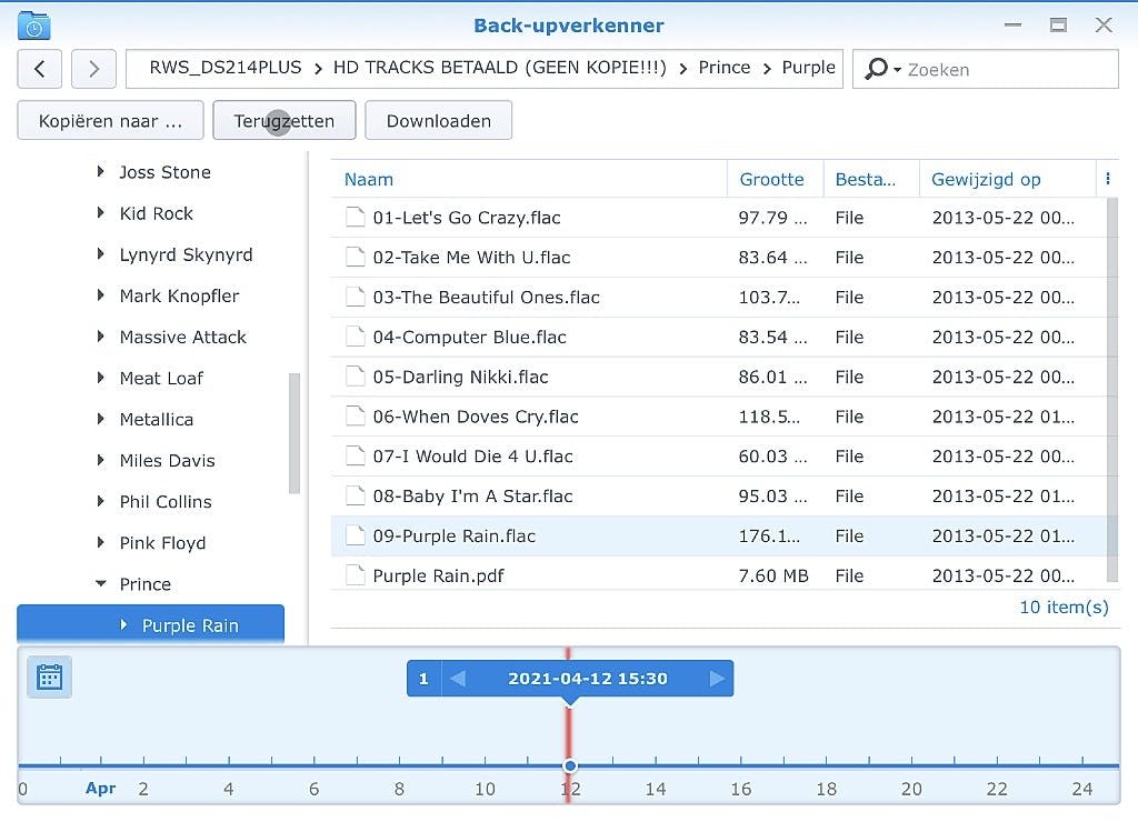 Om een back-up terug te zetten zijn er – al naar gelang wat je wenst – meerdere mogelijkheden. Ten eerste kun je een complete back-up zonder nadenken terugzetten. Handig als je bijvoorbeeld per ongeluk een complete map hebt gewist, of wanneer er iets heel ernstig mis is gegaan met de schijven in je NAS. In zo’n geval klik je in het venster van Hyper Back-up op de knop met de klok helemaal linksonder in dat venster (naast de +). Klik in het contextmenuutje op Gegevens, selecteer de (meestal) laatst gemaakte back-up en doorloop de rest van de wizard. Je kunt ook losse bestanden terugzetten. Klik daarvoor op Versielijst in het paneel rechts. Dubbelklik op een back-up waarvan je zeker weet dat een per ongeluk gewist bestand of (sub)map in aanwezig is. De ‘back-up bladeraar’ opent nu. Blader naar een bestand of (sub)map dat je wilt terugzetten, selecteer het en klik op de knop Terugzetten. Volg de eventuele instructies en klaar.