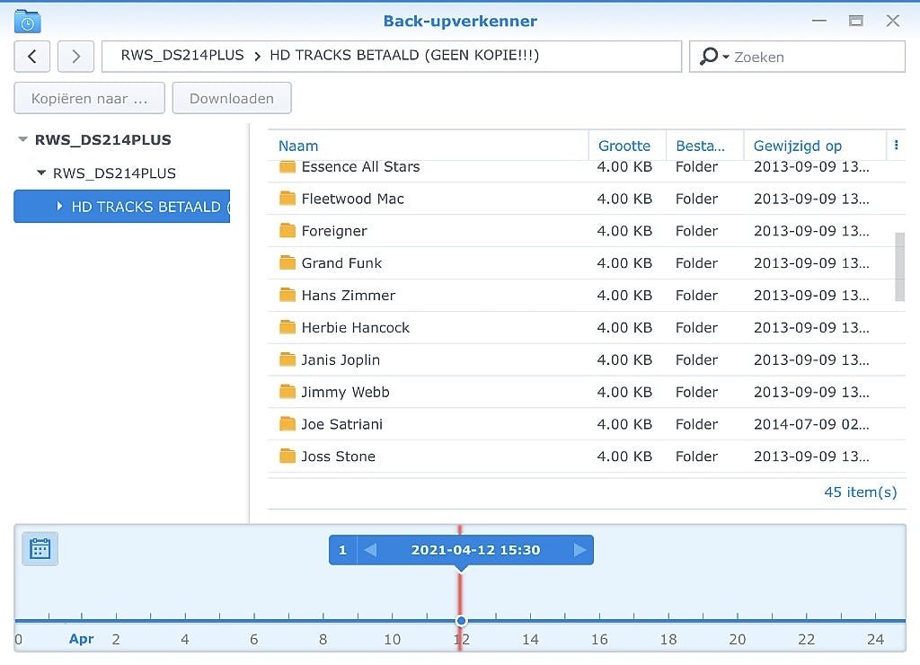 Ook kun je op de doel-NAS door de back-up heen bladeren. Het simpelst werkt dat door simpelweg de app File Station te openen. Blader naar de – in dit voorbeeld nog altijd – map HYPERBACKUP. Dubbelklik op een back-upmap en wederom opent de Back-upverkenner. Deze keer niet voorzien van de knop Terugzetten maar van de knop Kopiëren naar. Ofwel: je kunt de back-up nu lokaal opslaan of naar een nieuwe NAS overhevelen bijvoorbeeld. Onder normale omstandigheden heb je verder geen omkijken meer naar het back-upgebeuren!